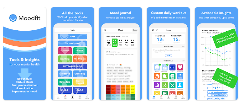 Moodfit은 ‘정신 건강의 피트니스 앱(Fitness for your mental health)’이라는 슬로건처럼, 감정 상태를 기록·분석하고 개선하는 데 도움을 주는 앱입니다.