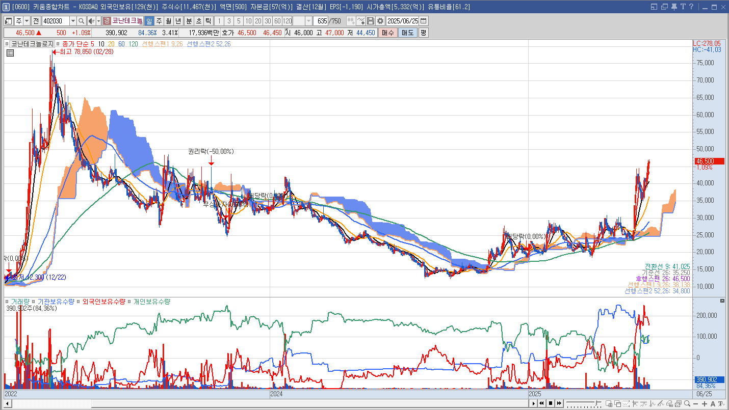- 시가총액 - 5천3백억 / 52주 최고가 - 47,000(6/25-46,000) / 지분관계 - 김영섬 외 11인 37.86%, sk텔레콤 20.57%, 한국항공우주 7.75%