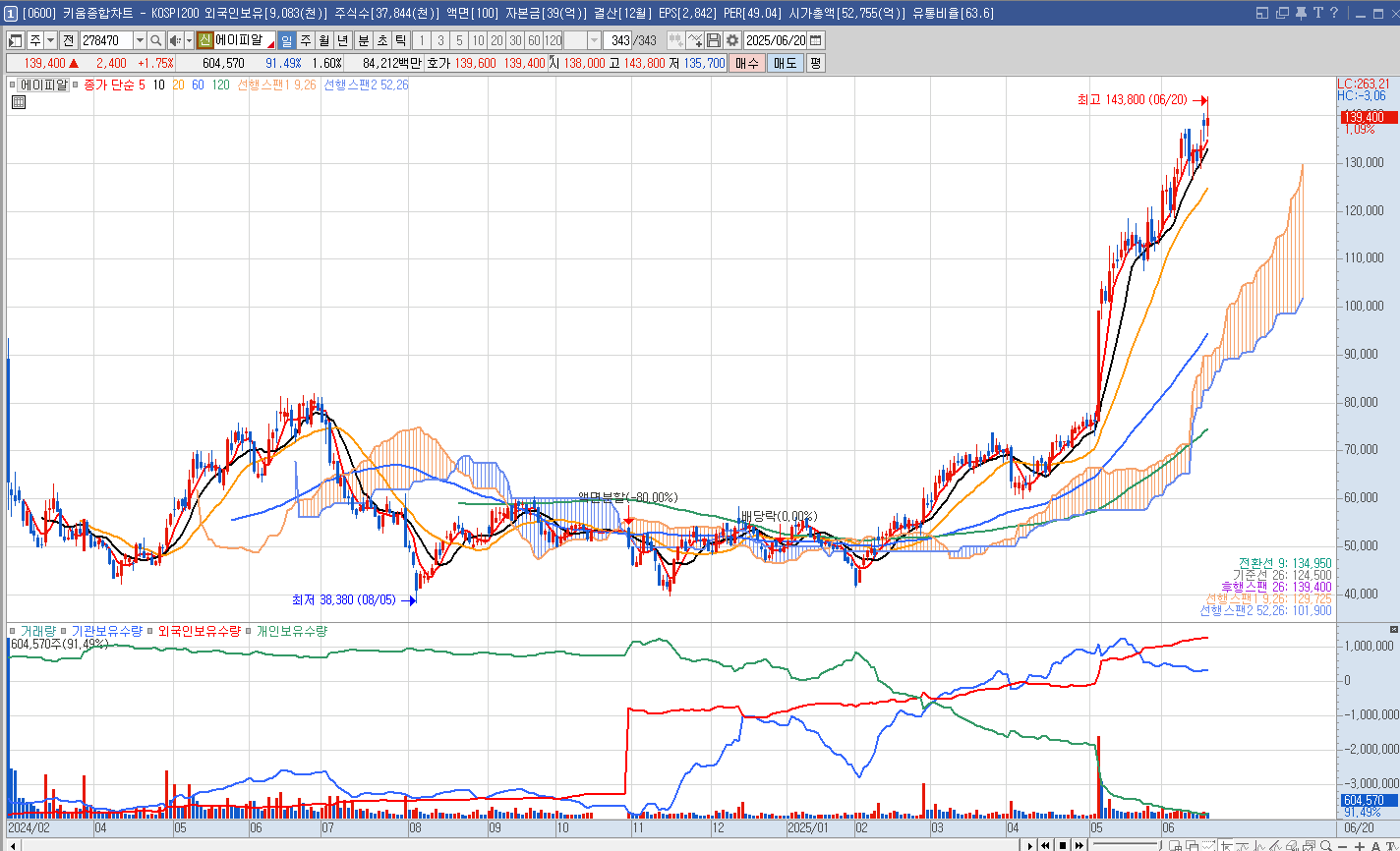 • 시가총액 - 5조 3천억 / 52주 최고가 -143,800(오늘종가-139,400)  / 지분관계 - 김병훈 외 5인 40%, 국민연금공단단 8.43%, Morgan Stanley 5.72%